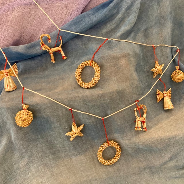 麦わらを組んで、一つ一つ手作りのガーランド。 麦わら細工一度でもされた方なら、麦を組んで立体を作り上げるのが、どんなに手間で手腕がいるかおわかりと思います。 立体ではありませんが、赤い糸で組まれた星は繊細できれいです。 95㎝の長さの紐に、トナカイ5✖️6㎝、リース直径5;5㎝、星4✖️4㎝、ボール直径2、5㎝、天使5、5✖️5、5㎝の5種類が2個ずつついてます。 このままガーランドとしても、一つずつとってツリーのオーナメントとしても楽しめます。 はるか以前は東欧などで作られた品々が入荷しておりましたが、もう叶いません。 中国で生産されておりますが、日本の会社が管理しております。