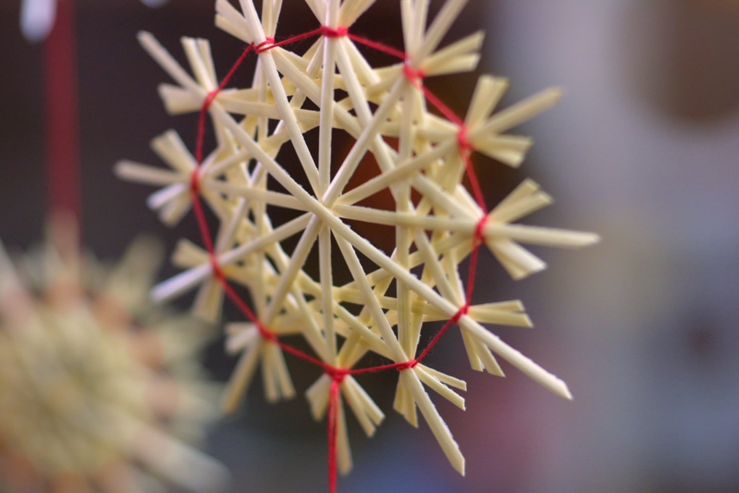 麦わらの星、直径約20㎝です。ボリュームがあるので、ツリーに飾るときれいで目立ちます。 窓際に吊るすと影もきれいです。経年変化で麦の色も深まっていきます。