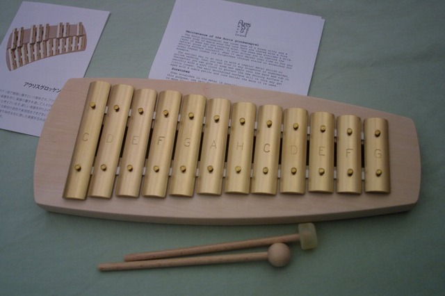 アウリス・シェルズグロッケン<12音>と組み合わせれば、 変調も弾けるグロッケンとなります。 30×12×h2、2cm 鍵盤の先が木製台座から出ているのは、 12音の台座にぴたっとはまるようにデザインされております。