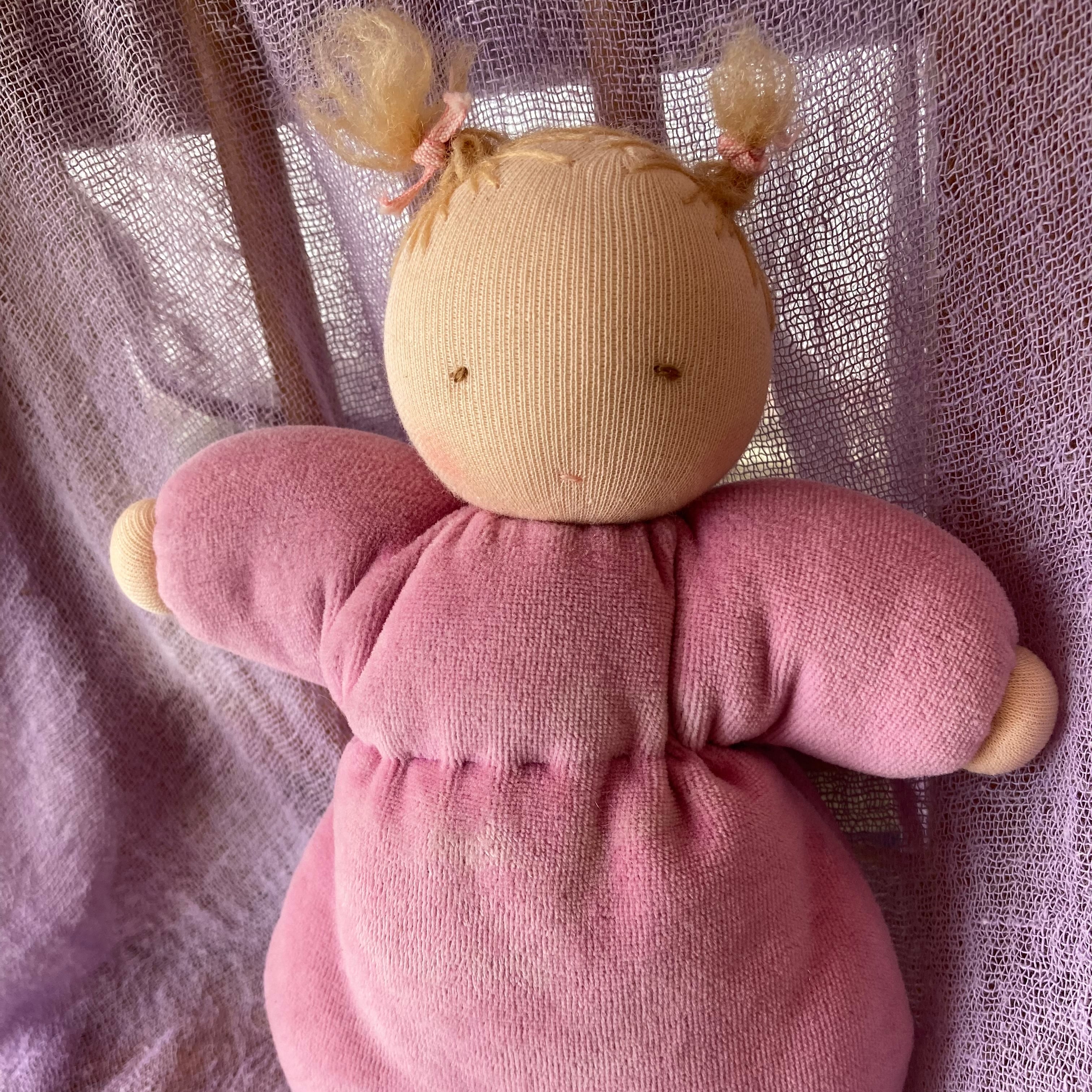 大きさ20cmのベロアを着たお人形です。おくるみ型のソフィまたは足のあるヨアキムのどちらかを選んでおつくりいただけます。
