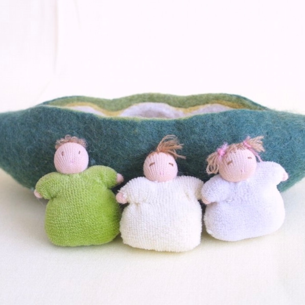 羊毛をフェルトしてそら豆のさやを作り、中で暮らす3人の赤ちゃんをヴェロアを縫って作るキットです。そらまめのさや用の4色の羊毛、芯用のくるみ、3人の赤ちゃん用ヴェロアとジャージなどの材料がセットされています。「ウオルドルフ人形と小さな仲間たち」が廃版となりましたので、作り方が入るようになりました。