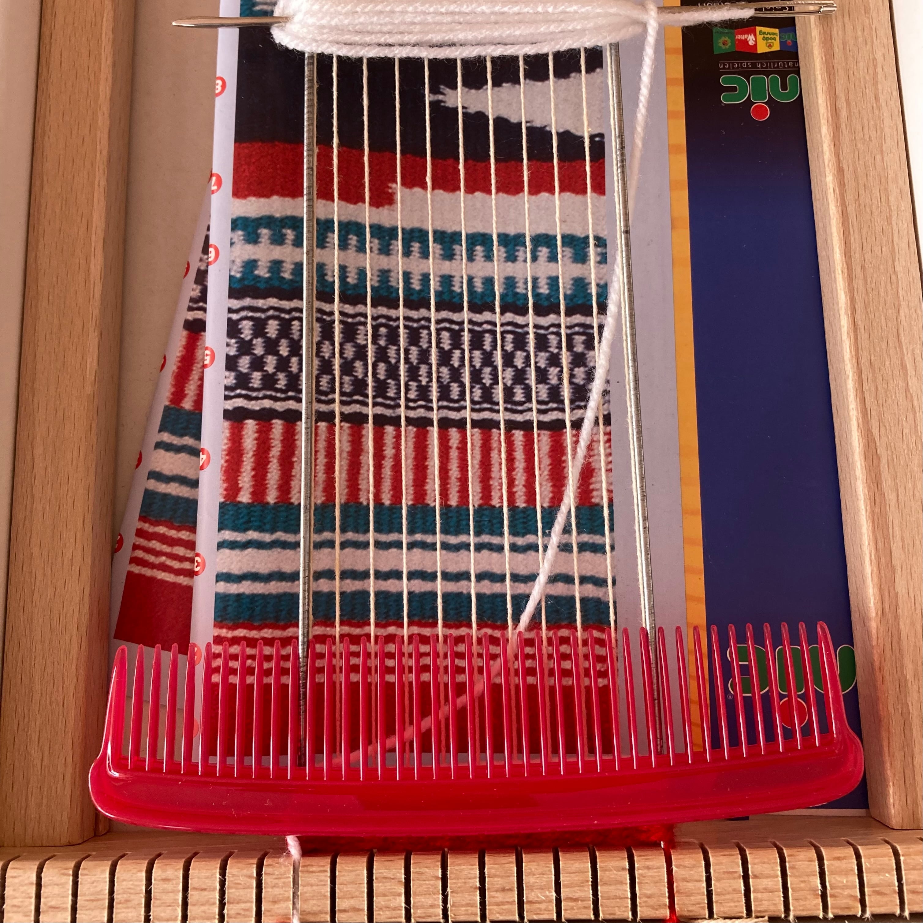 好みの毛糸などを横糸として、右下写真のように通して織っていく道具です。