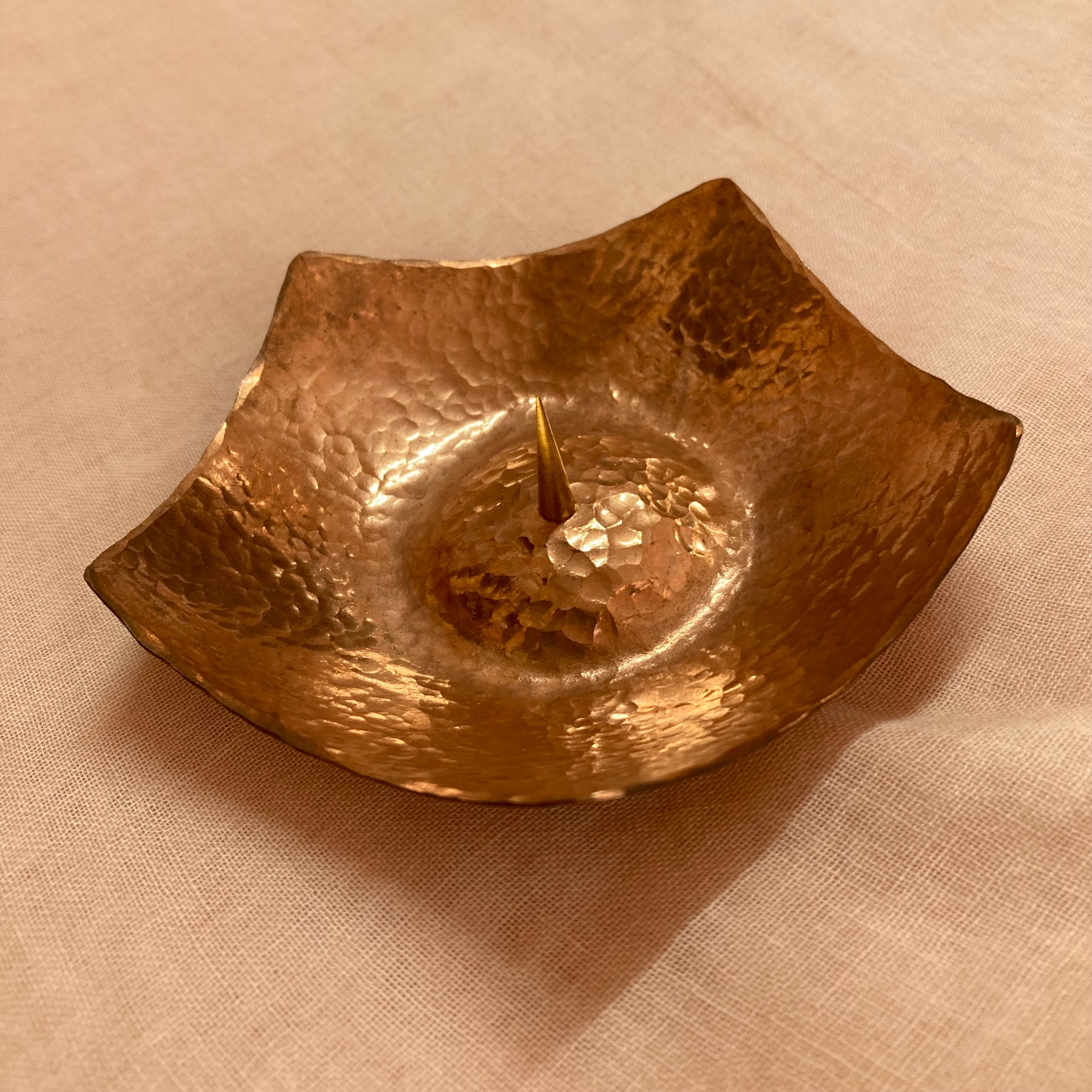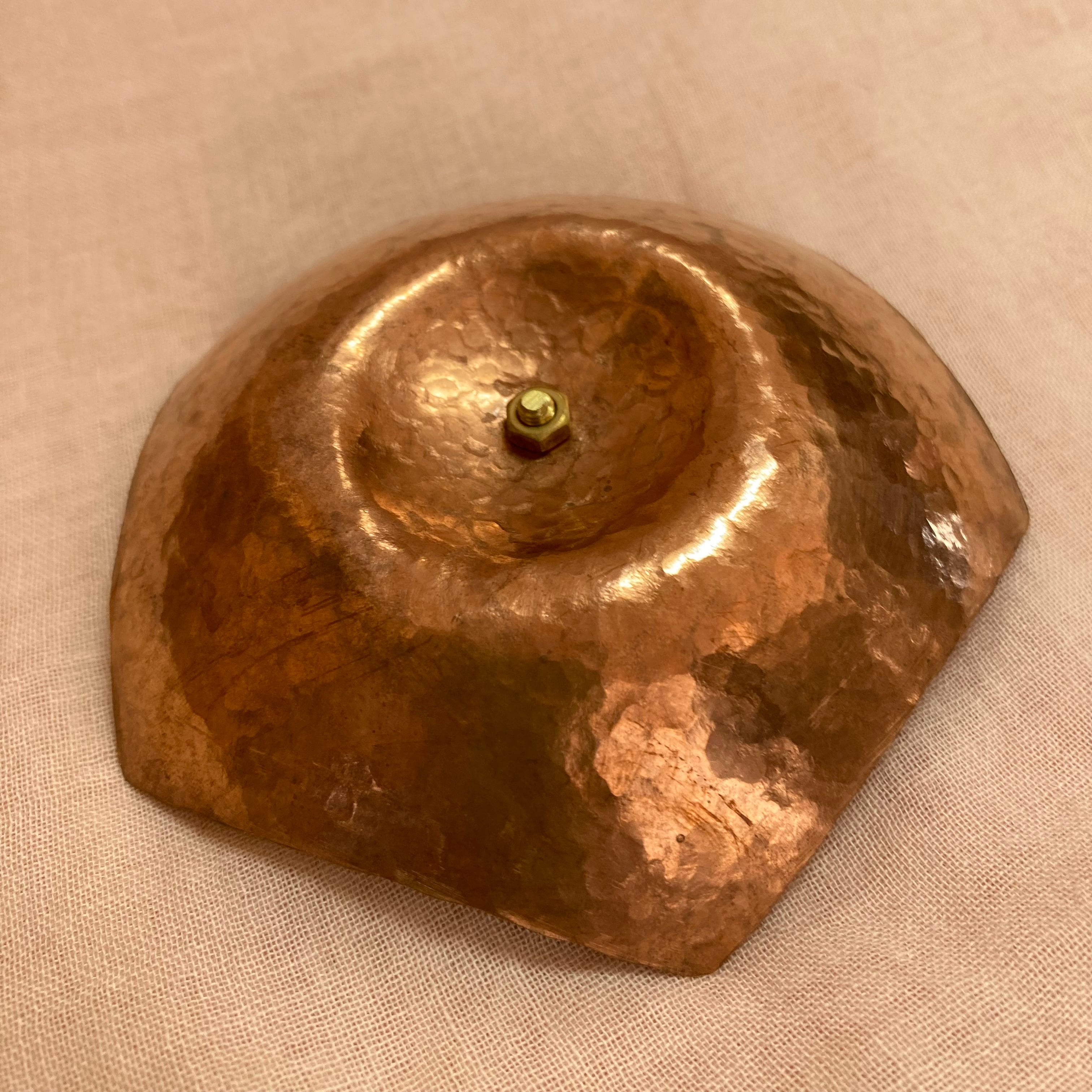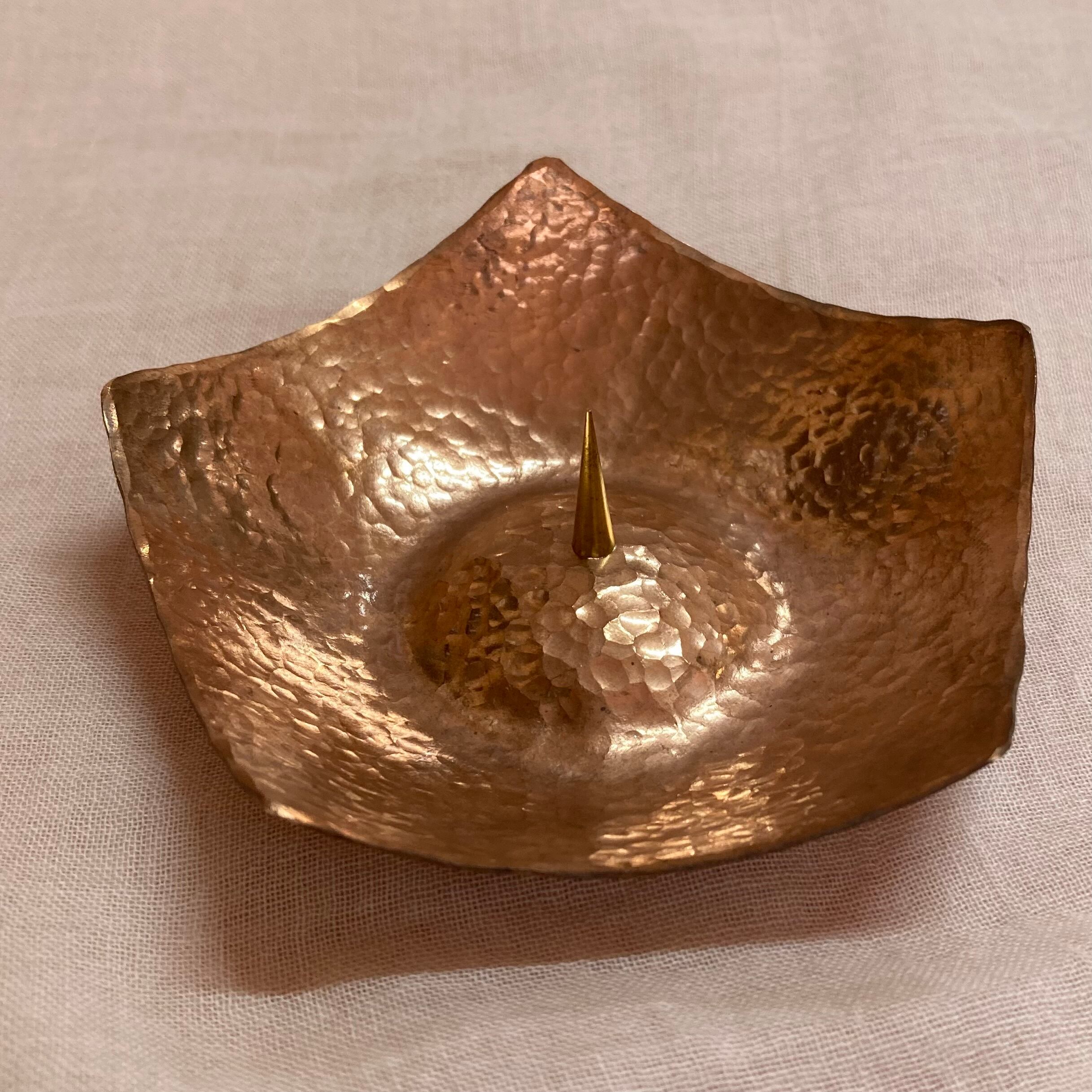 銅製なので、経年変化で焦茶ぽくなっていきます。その変化を楽しんでいただけるとうれしいです。ドイツ製、75g、直径10、5㎝高さ2㎝、針の高さ2㎝