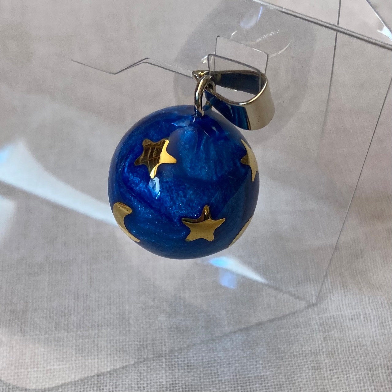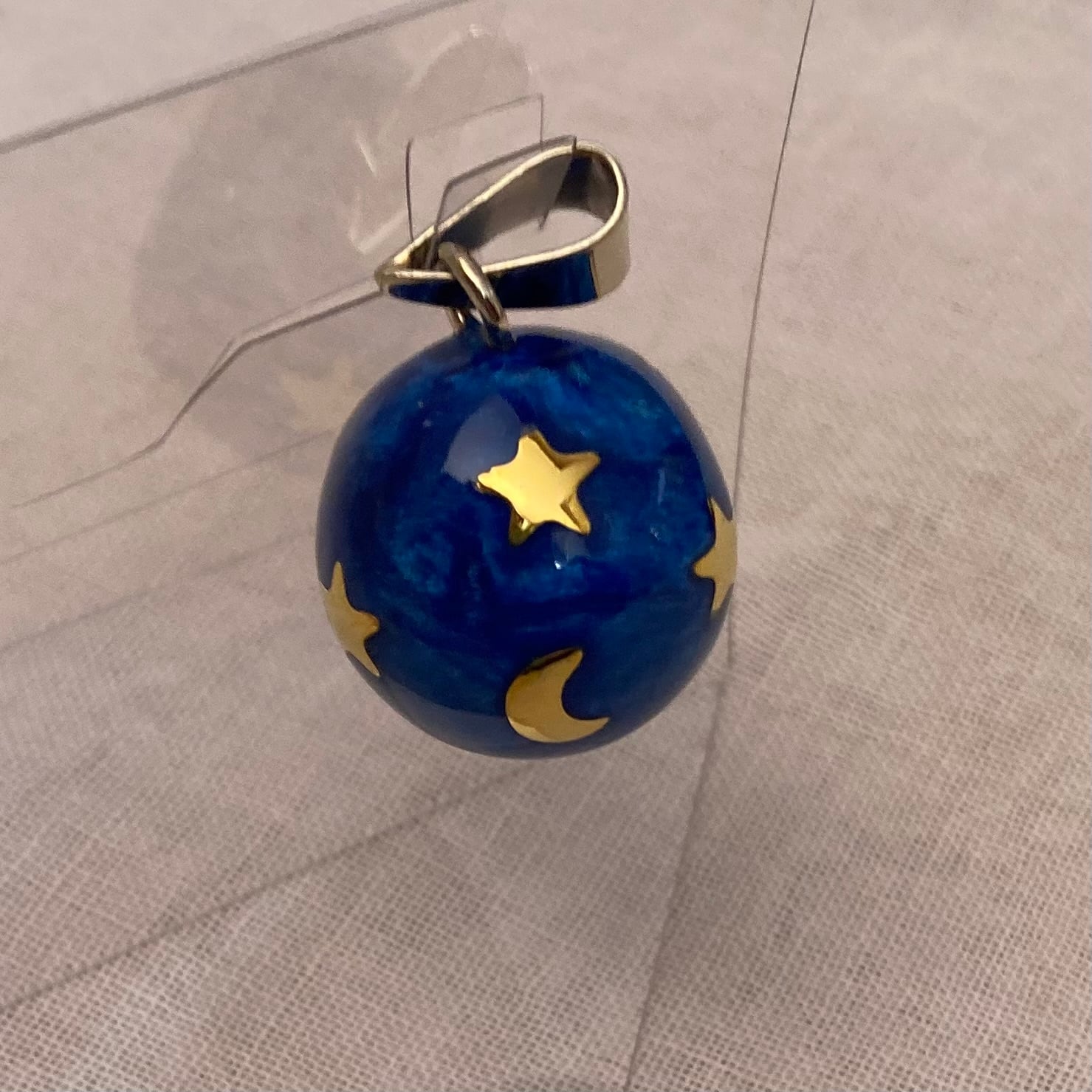 エナメルのブルーに、金色の月と星が映えるオルゴールボールです。